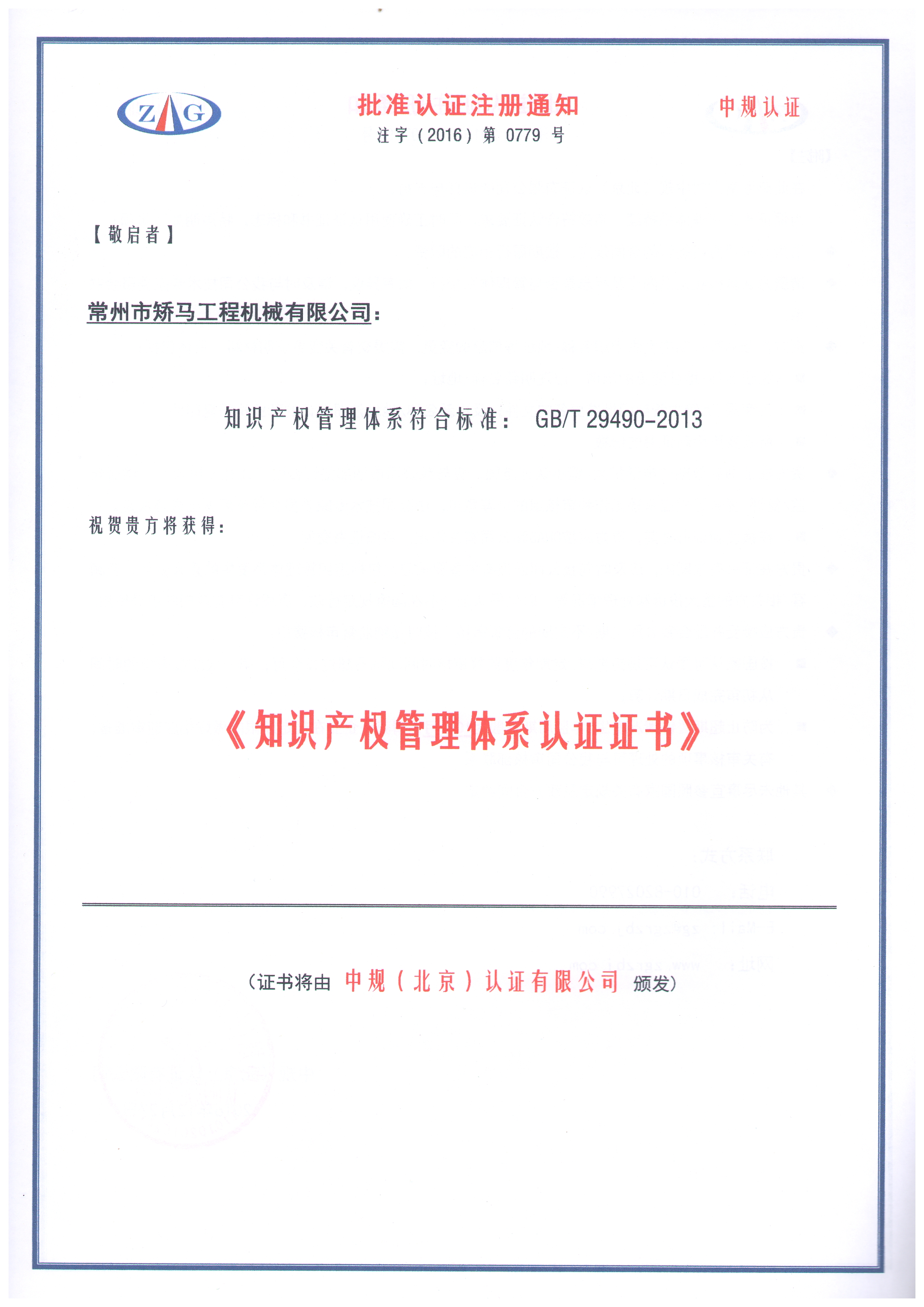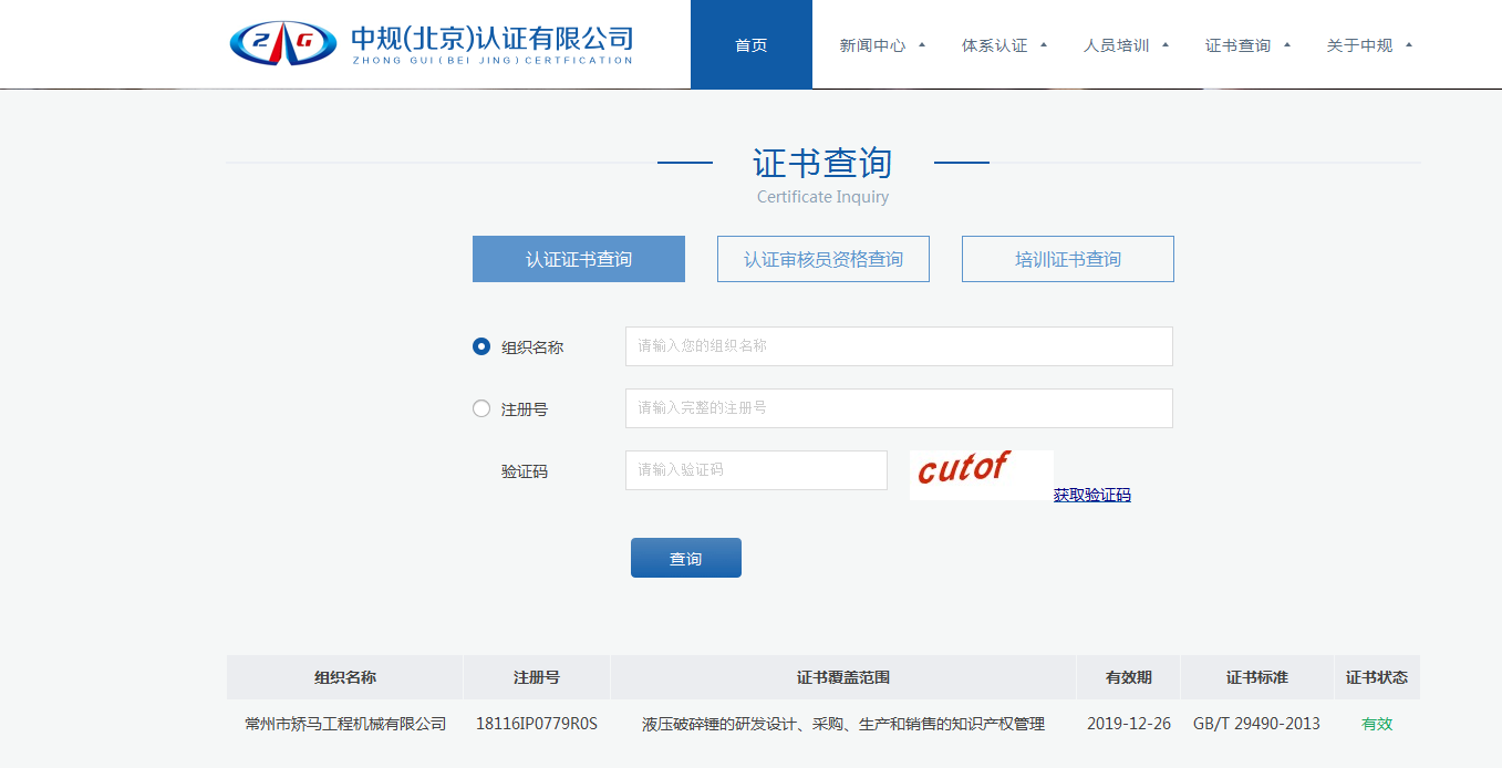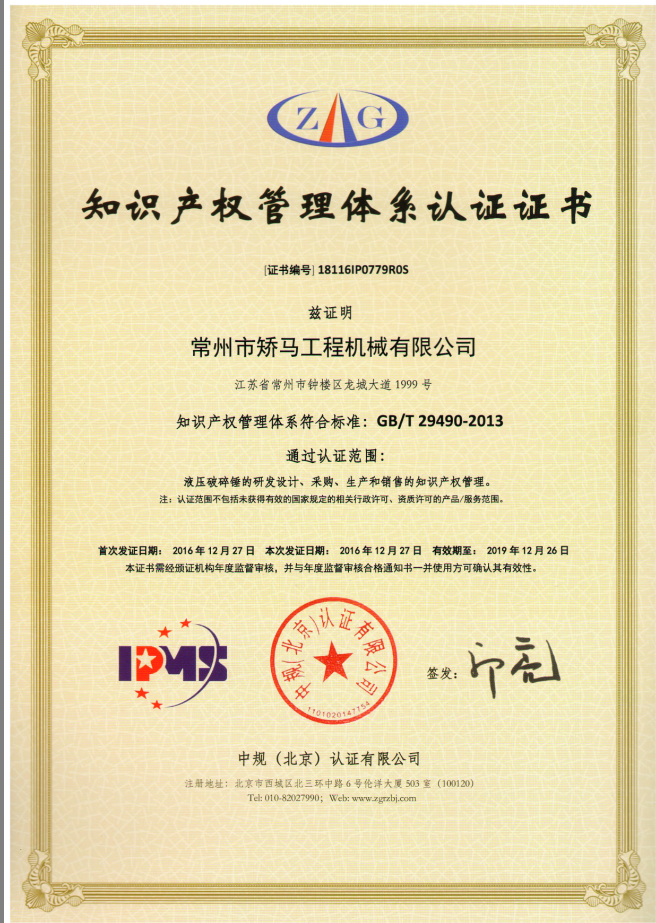 热烈祝贺本公司通过液压破碎锤的研发设计、采购、生产和销售的知识产权管理认证常州市矫马工程机械有限公司18116IP0779R0S液压破碎锤的研发设计、采购、生产和销售的知识产权管理2019-12-26GB/T 29490-2013有效